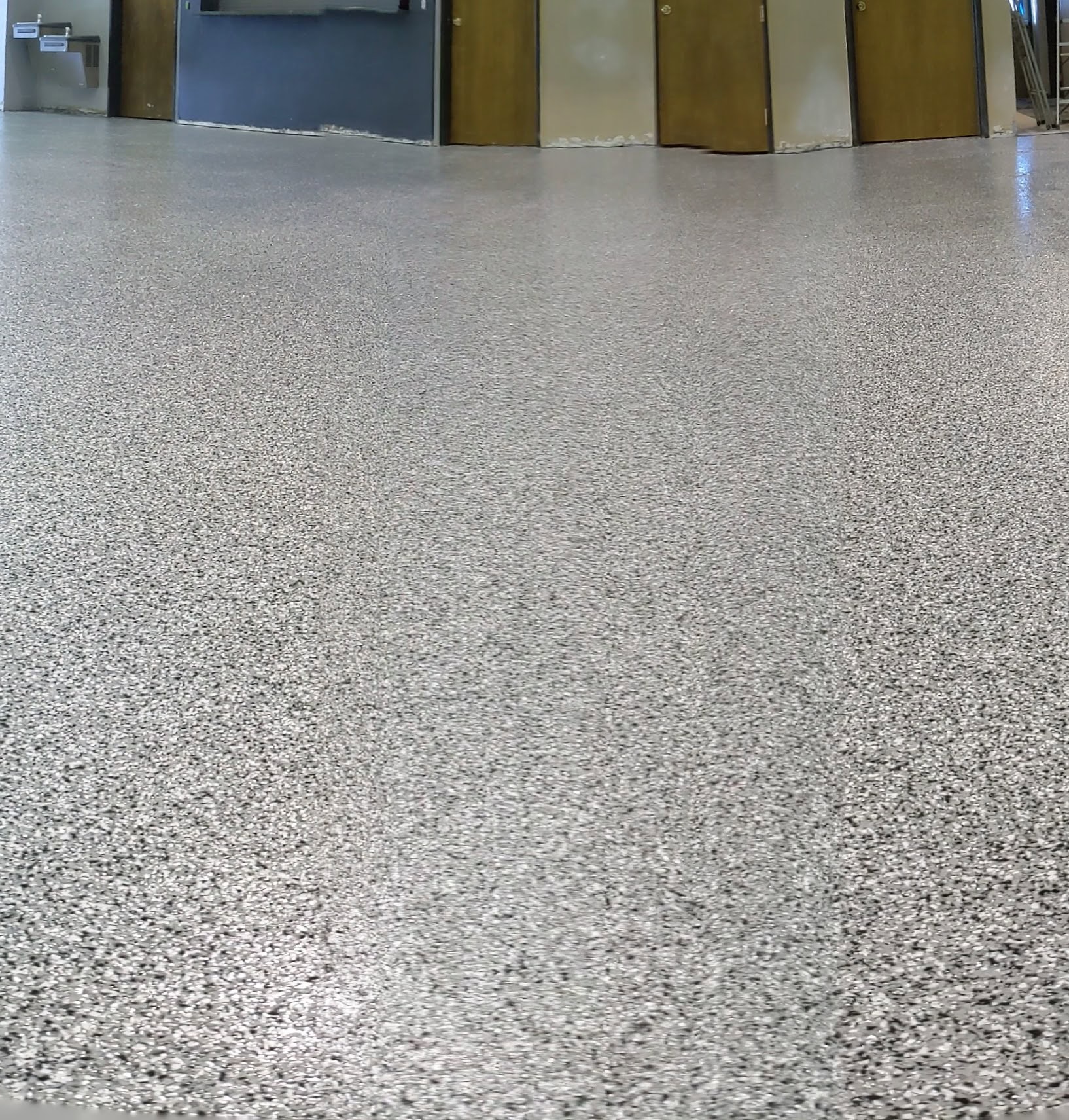 After the Industrial diamond-grinding to ensure a permanent bond, we install primer coat of polyaspartic. Then a second coat is applied, then the flake broadcast.