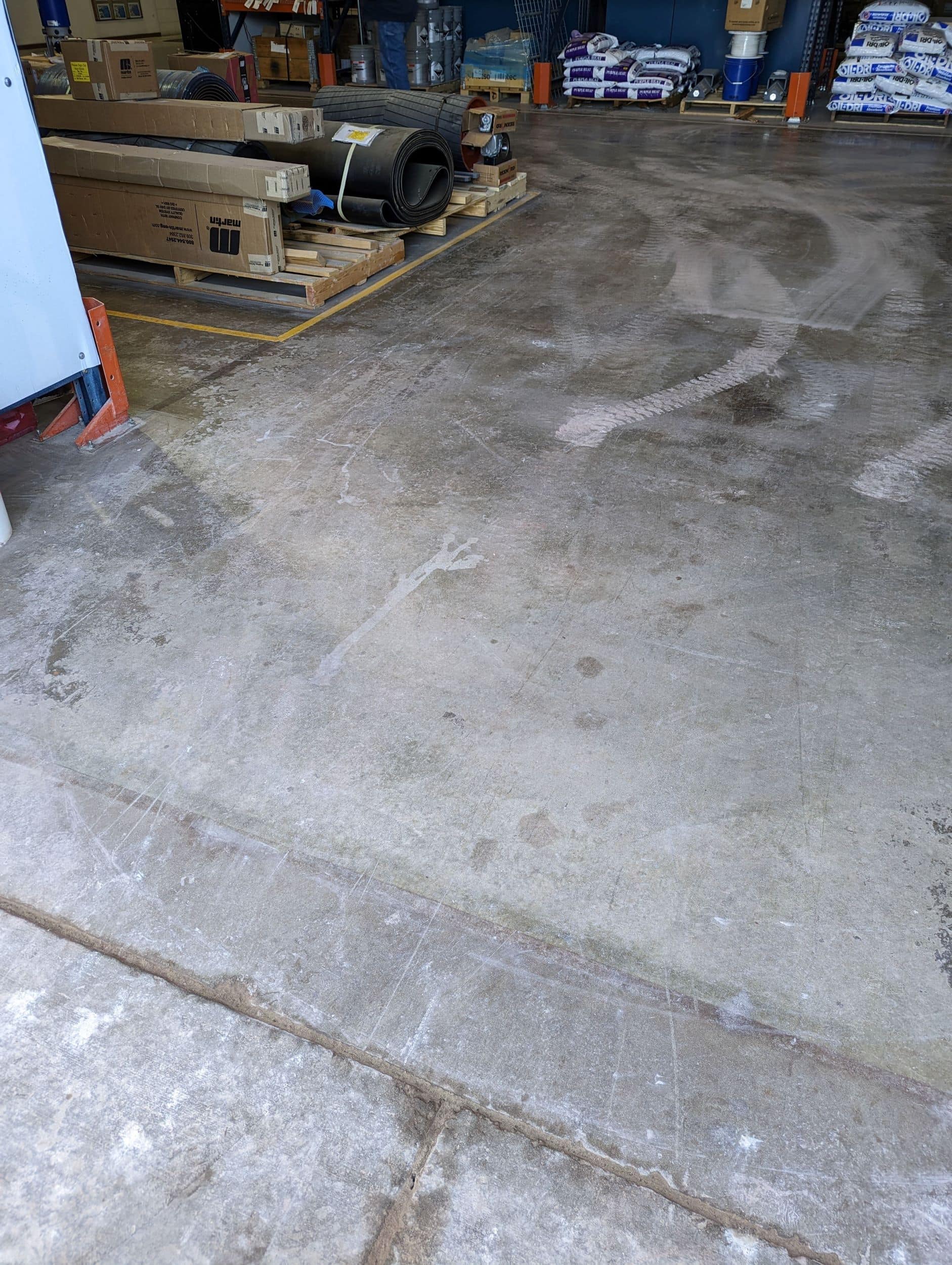 Porous, oil-stained, and dusty industrial slab.