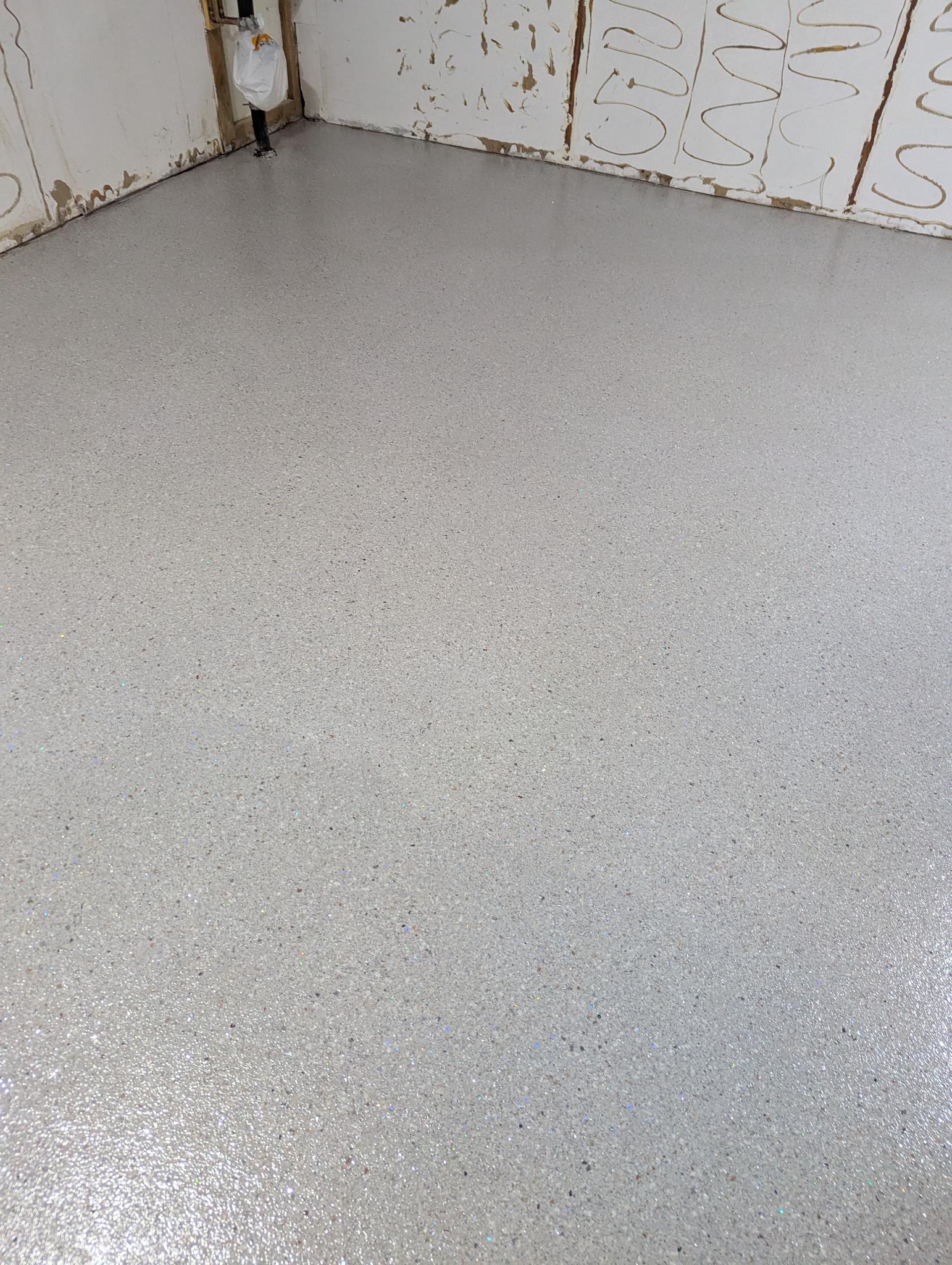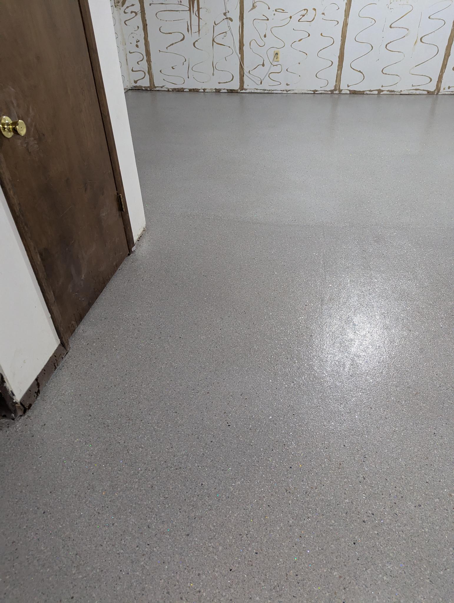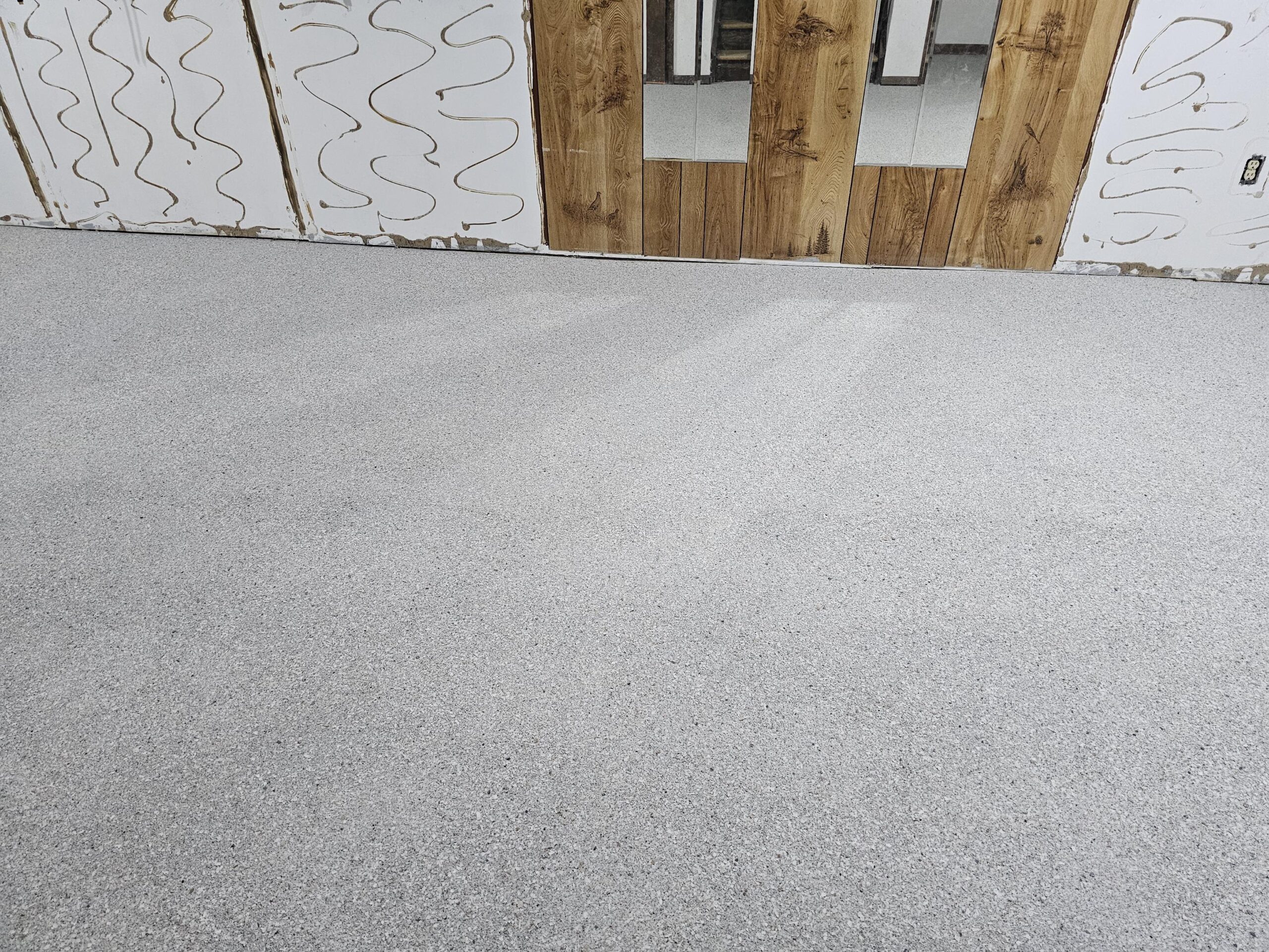 This complete basement in the Dublin Park area of Colorado Springs features our Flintstone polished concrete collection floor coating, selected for its clean, modern character and subtle stone-inspired variation.