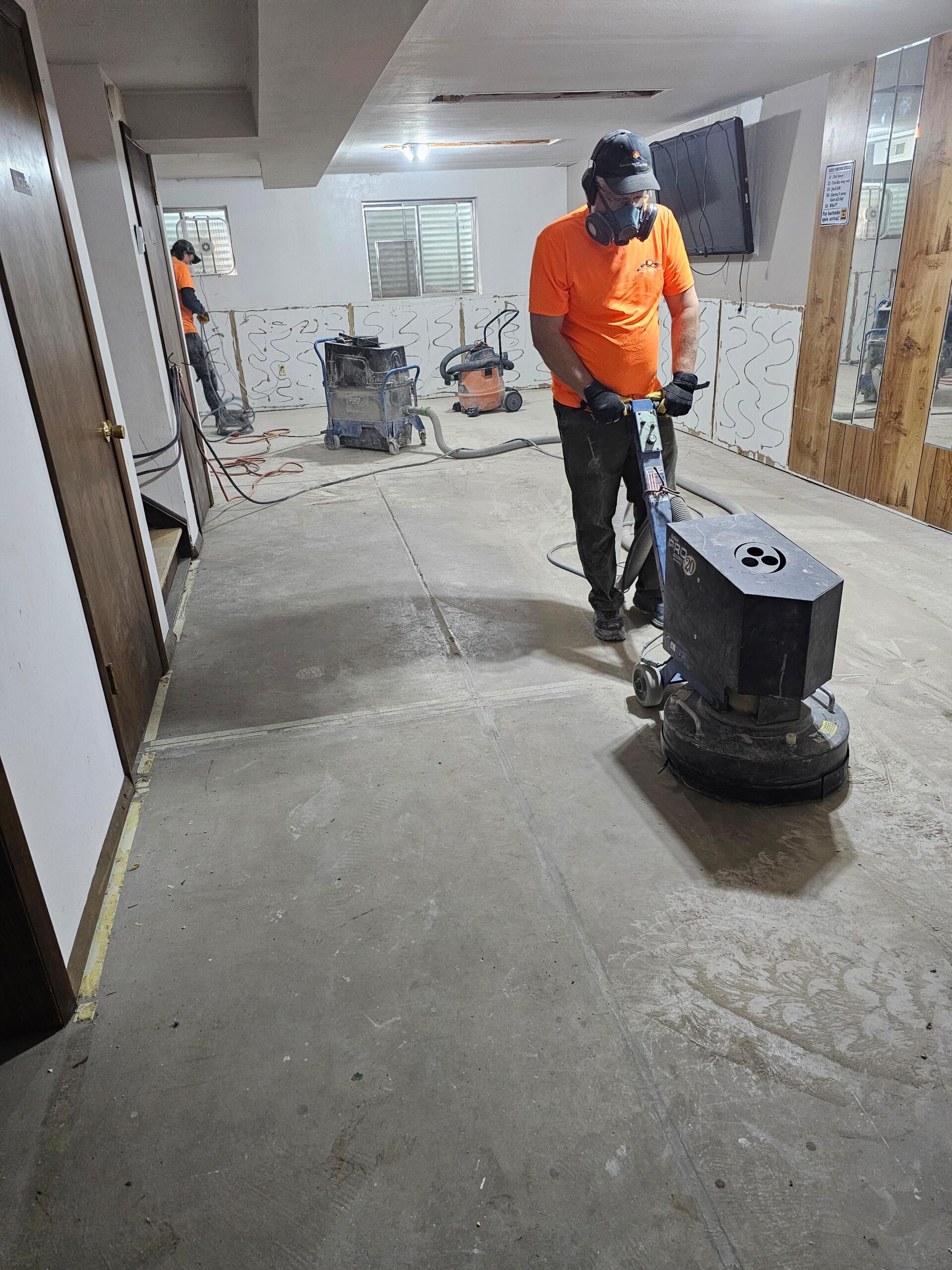 Before starting, the slab was evaluated and prepped to ensure long-term performance. We repaired hairline cracks as needed, then performed diamond grinding to remove surface imperfections and establish a uniform profile.